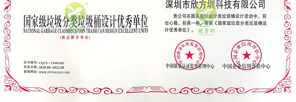 欣方圳擁有數(shù)十款國(guó)家知識(shí)產(chǎn)權(quán)垃圾桶專利證書,專利產(chǎn)品囊括不銹鋼、鋼板、玻璃鋼等市場(chǎng)主流垃圾桶應(yīng)用材質(zhì),專業(yè)生產(chǎn)廠家給客戶更多選擇空間。