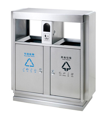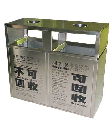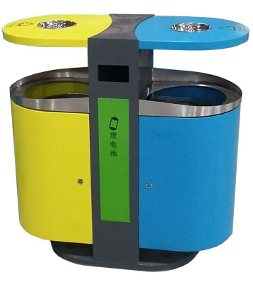 深圳新標準城中村街道社區不銹鋼五分類垃圾桶由有害垃圾、玻璃、金塑紙(為金屬、塑料、紙張的簡稱)、廚余垃圾、其他垃圾這5分類不銹鋼垃圾桶組合而成。其中金塑紙、其他垃圾日常產生量較大,所以分類收集容器也